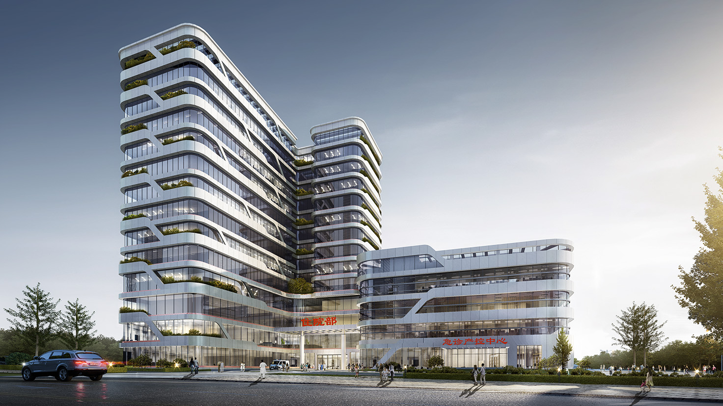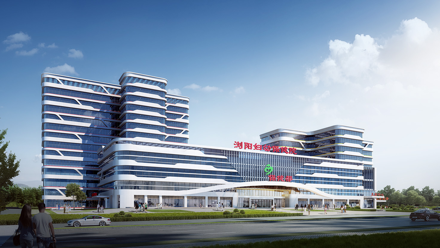 工程简介:浏阳市妇幼保健院择址关口长兴片区,根据妇幼保健院长期业务发展整体规划设计,将分两期进行建设,拟设置总床位数800张:其中一期设计床位数为550张,地上建筑面积60000平方米,地下建筑面积20000平方米,项目投资约4.5亿,包含新建医疗保健综合楼、妇产住院楼、儿童住院楼、行政后勤楼、地下停车库(含设备用房、防空地下室)以及相关配套设施;二期设计床位数为250张,包含儿童康复中心与专科医疗中心、住院楼、培训中心和月子中心等功能。在场地进深较小、车行开口受限的条件下,设计创造性地采用偏心十字型护理单元为基本??橄嗷プ楹?,巧妙地围合出交通岛和治愈花园,打造高效安全、以人为本的治愈之城。
